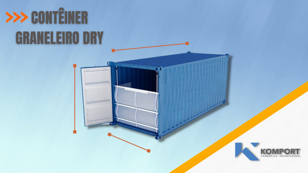 Contêiner Graneleiro Dry: com medida de 20 pés, esse tipo de contêiner é ideal para o carregamento de grãos, como arroz, milho, sementes, entre outros;