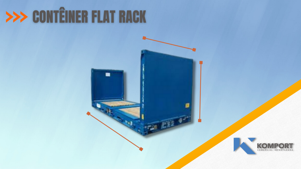 Contêiner Flat Rack: esse contêiner tem opções de 20 e 40 pés e não possui teto ou laterais, pois é projetado para transportar grandes cargas como máquinas pesadas;