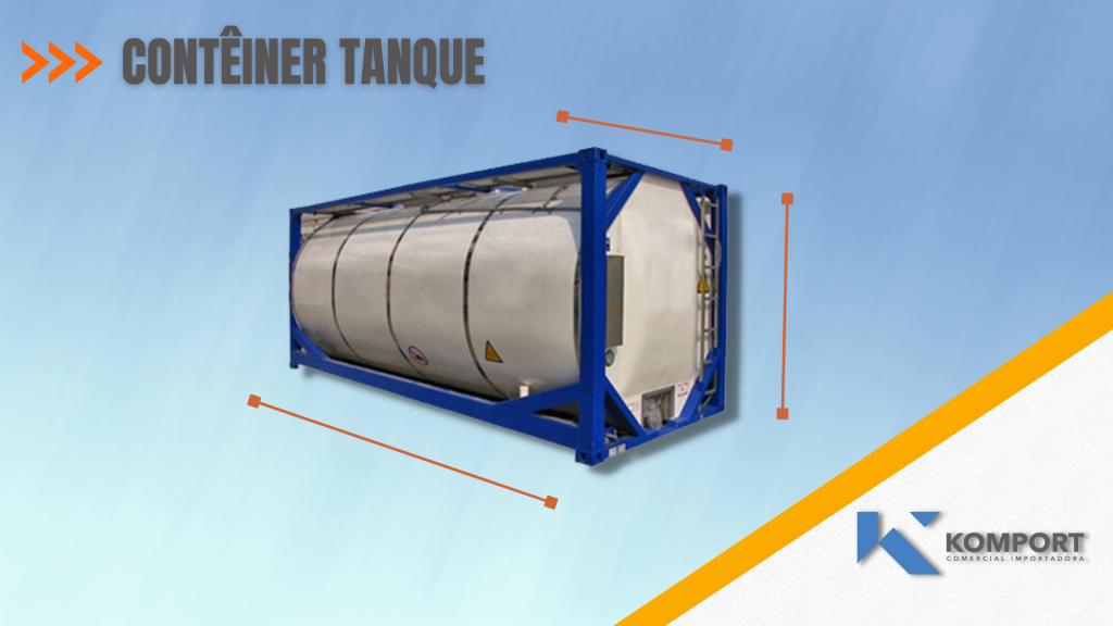 Contêiner Tanque: revestido de fibra de vidro ou alumínio, esse modelo é utilizado principalmente para transporte de materiais químicos e corrosivos e possui medida de 20 pés;
