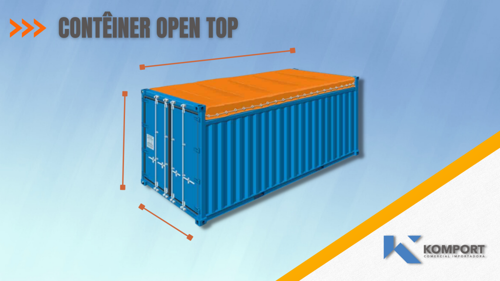 Contêiner Open Top: geralmente utilizado para transporte de produtos convencionais que possuem excesso de altura que não caibam no modelo Dry Box. Possui dimensões de 20 e 40 pés;