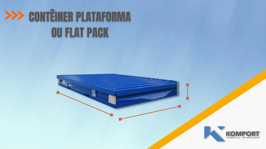 Contêiner Plataforma ou Flat Pack: semelhante ao modelo Flat Rack, o contêiner plataforma tem opções de 20 e 40 pés e não possui nem laterais nem teto, ideal para o transporte de cargas pesadas e difíceis de carregar;