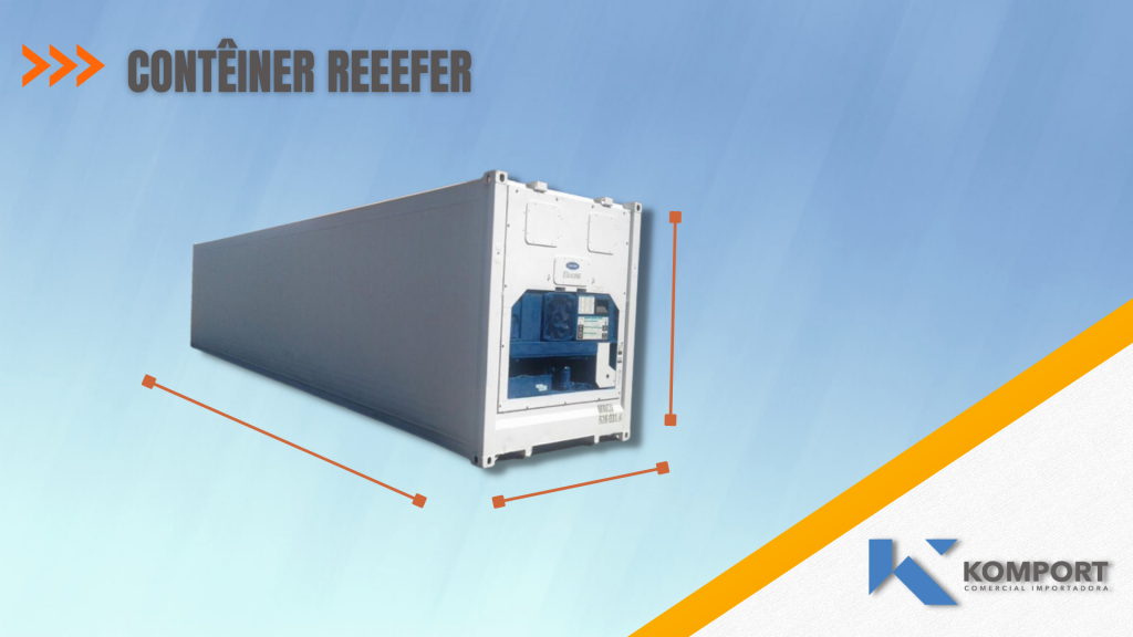 Contêiner Reefer (Refrigerado): com dimensões de 20 e 40 pés, possui equipamento próprio para gerar frio, recomendado para transporte de cargas que exijam a temperatura controlada ou abaixo de zero, como peixes, carnes e frutas.